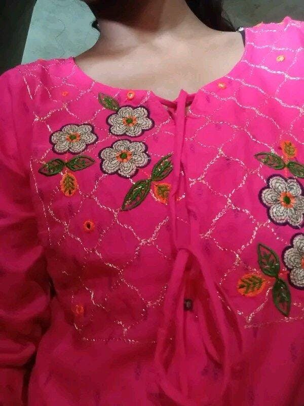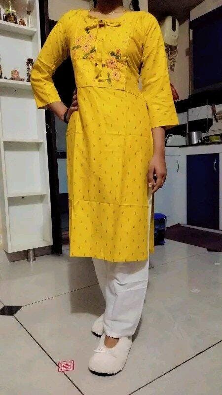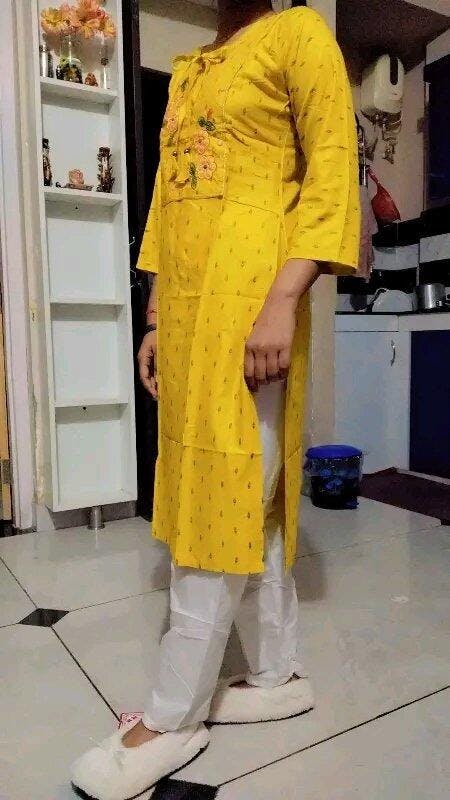 The A-line kurta features intricate floral embroidery on the yoke, enhanced with a stylish tie-up neckline that adds a modern touch to traditional wear. Its calf-length design pairs perfectly with the solid white pants, creating a balanced and refined ensemble. Finished with three-quarter sleeves and a neatly stitched construction, this set is ideal for parties, casual gatherings, and semi-festive occasions.