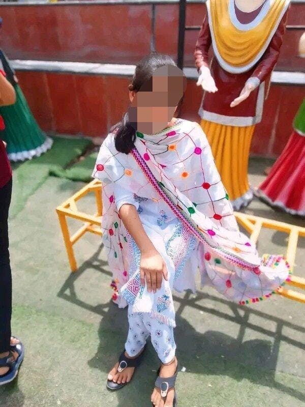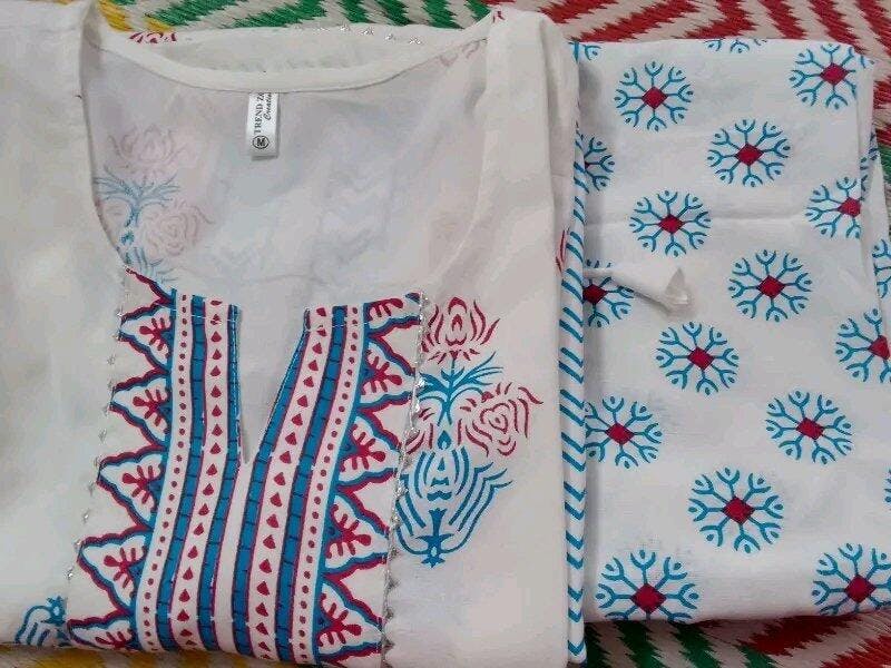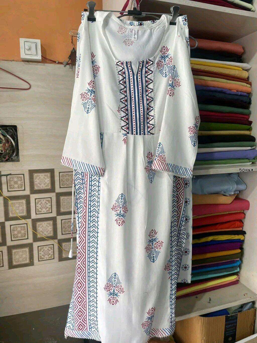 Paired with comfortable printed pants, this ensemble blends traditional aesthetics with modern ease. The three-quarter sleeves and thoughtfully designed neckline enhance its versatile appeal.