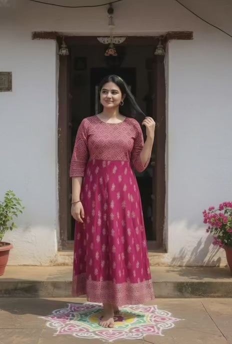 Designed with three-quarter regular sleeves and a stitched finish, this ankle-length kurti flows beautifully with every movement, offering both style and comfort.
