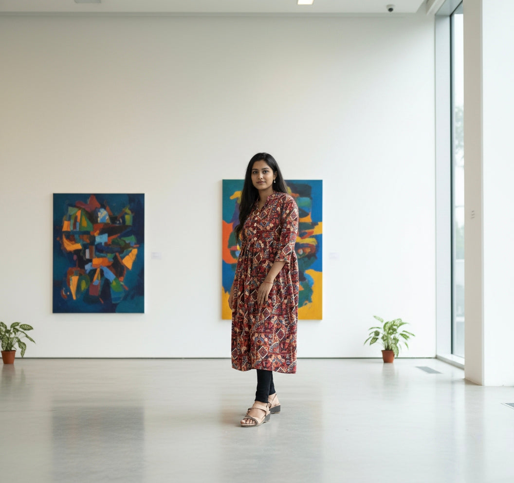 Adorned with a vibrant floral printed pattern, this versatile kurti can be styled as a dress or paired with jeans, leggings, or palazzos for an ethnic-fusion appeal.